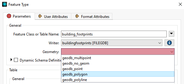 Ensure that the Table Handling is set to "Create If Needed". Click OK to close the dialog and then connect the new feature type to the output port of the Shapefile Reader.