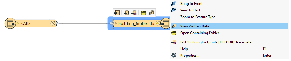 After adding the writer, run the workspace, then right-click on the building_footprints feature type to bring up the popup menu. Then click View Written Data... to open the dataset in Visual Preview.