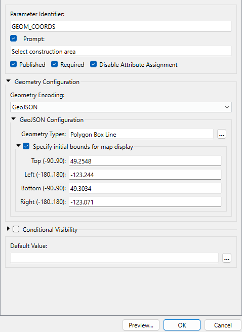 The initial bounds will be the area shown in FME Flow. Larger bounds will have the map zoomed out, and smaller bounds will have the map zoomed in. Your dialog should look like this: