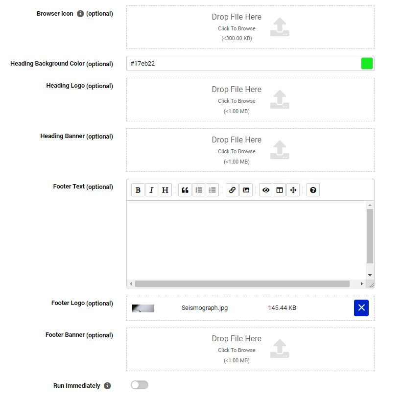 Change Header Background Color to green. Then download Seismograph.jpg and set it as the Footer Logo. You can also edit any of the other customization parameters if you wish.
