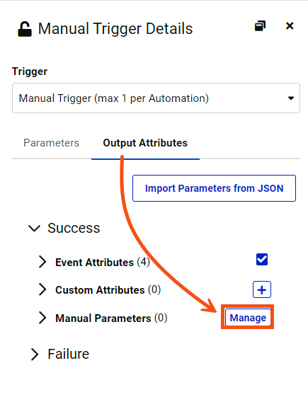 Automation Apps enable complex workflows to be run on demand with configurable input parameters. The manual trigger in Automations can be configured to prompt you with a list of parameters generated from the existing ones. These parameters will appear on the Automation Apps page. To create manual parameters, you will need to go to Automations > Manual Trigger > Output Attributes> Success > Manual Parameters > Manage.