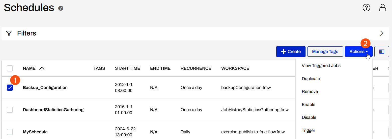 The Schedules interface is accessed by clicking Manage Schedules within the Schedules menu. Schedules can be selected and you can quickly trigger, enable, duplicate, and disable scheduled tasks.