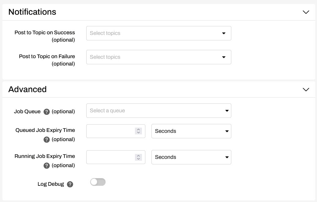 If you scroll to the bottom, you will find Notifications and Advanced expandable sections. The Notifications are used to post to a previously configured Topic and the Advanced options allow you to select a Job Queue and set Job Expiry Times.