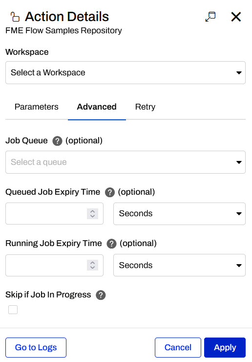 The next few parameters configure how the workspace is to run. Once a workspace is selected, FME Flow will then expose any published parameters that exist in the workspace.