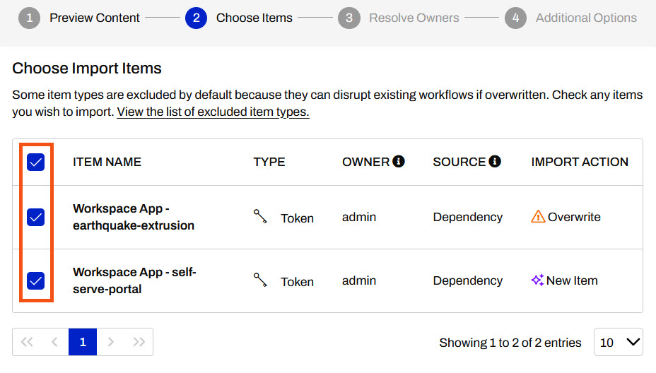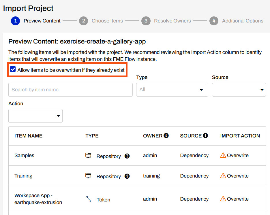 In the Preview Content step, allow items to be overwritten if they already exist. This project contains workspaces and workspace apps that you will integrate into a Gallery App. Then click Continue to go to the next step.