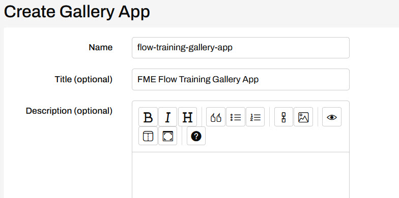 On the Create Gallery App page, give your app a name and optionally add a title and description.