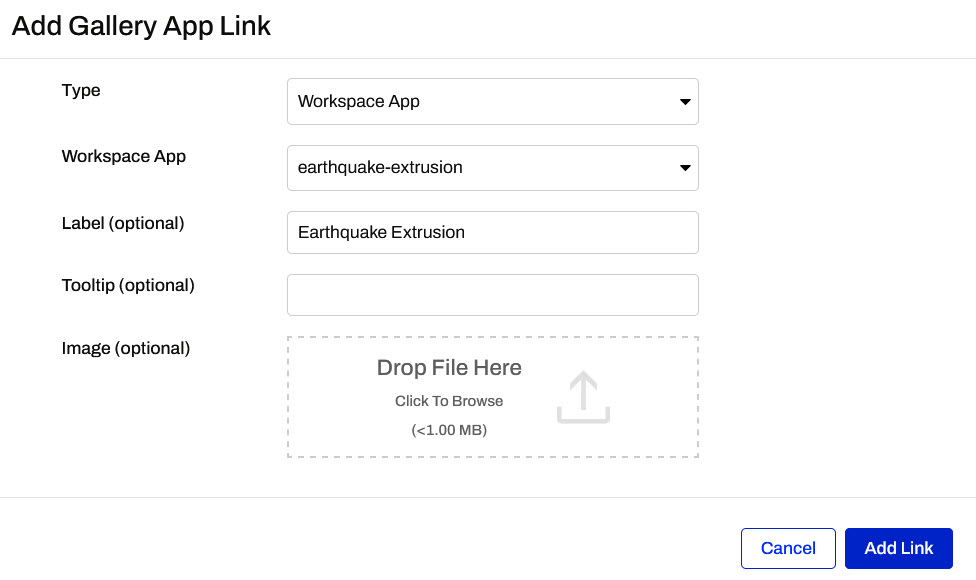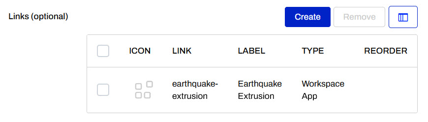 For Type, select Workspace App and then select the earthquake-extrusion app. The label is the text that appears with this app on the Gallery App landing page. You can label this workspace app Earthquake Extrusion and then click Add Link to close the window.