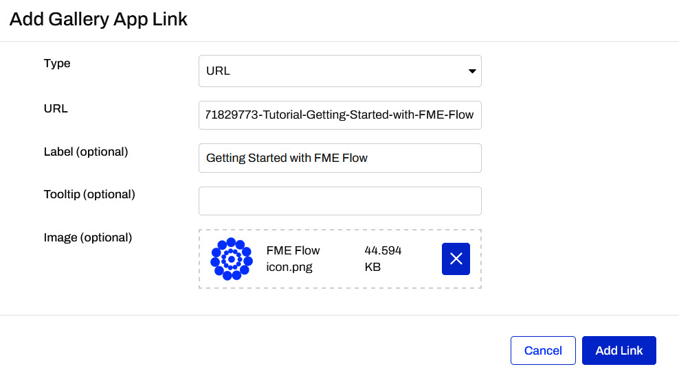 For the image, download FME Flow icon.png and add it as the Image for the Link.
