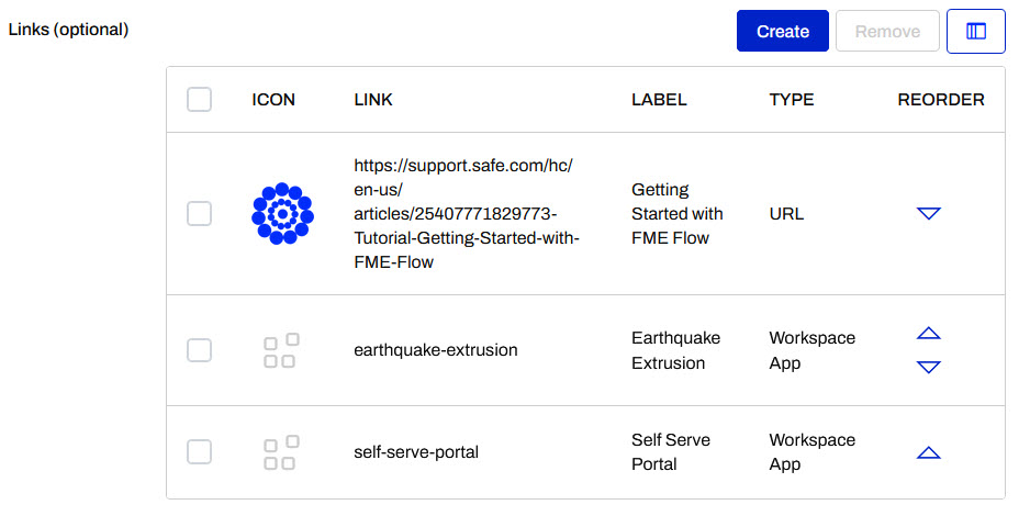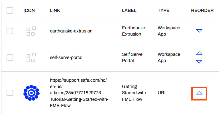 Since the Getting Started with FME Flow is introductory, you want it to appear first on your Gallery App. Click the up arrow in the Reorder column for the URL link, then click it again to move it to the top of the list.