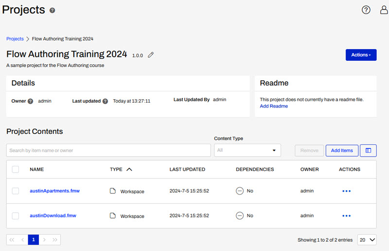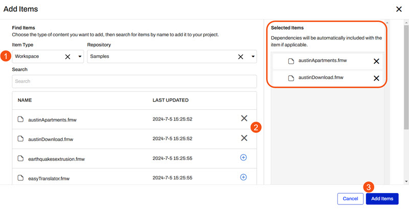 Under Project Contents, click on the blue box “Add Items” to select which items to include in your project. A project can include just about any FME Flow object you create or upload, see our documentation on Projects for a list of items that may be included in Projects. In this exercise, we will create a project of Sample workspaces using data from the City of Austin.