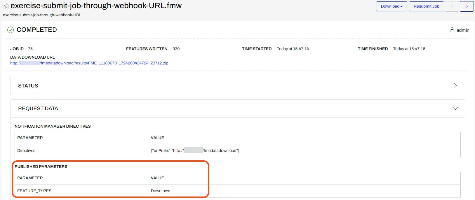 Click the Direct Link to the workspace in the Translation Log http://localhost/fmeserver/workspaces/run/Flow%20Authoring/exercise-submit-job-through-webhook-url.fmw and log in if necessary.