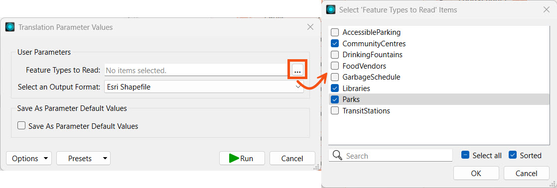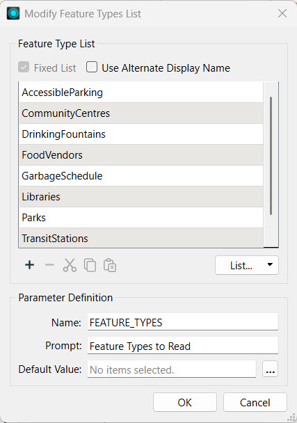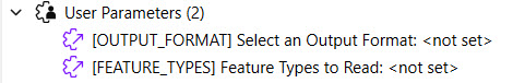 You could also create this user parameter in the Manage User Parameters window. However, this method automatically generates the list of available feature types to select from and link the FEATURE_TYPES parameter to the Feature Types to Read writer parameter, so this method is quicker for this scenario.