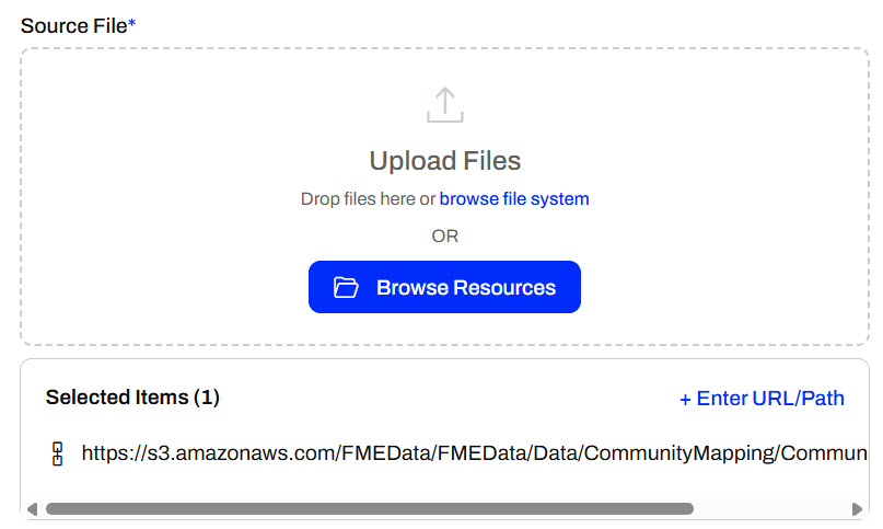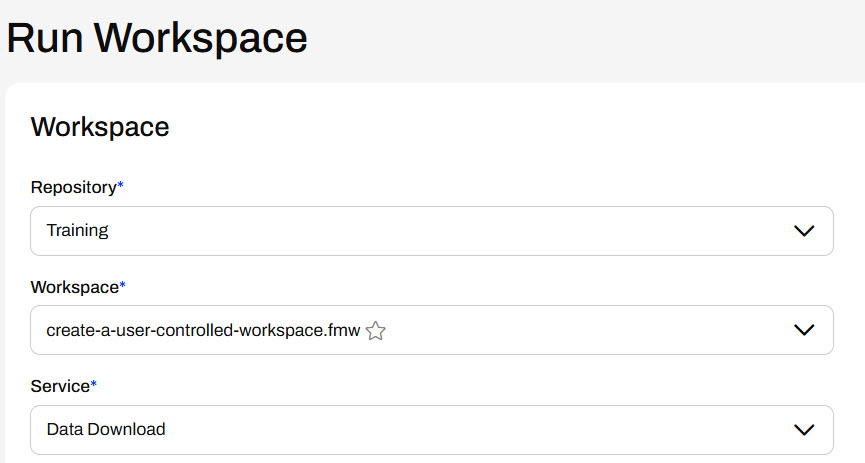 FME Flow displays published parameters in a sleek, easy-to-use form that you populate before running the workspace. FME Flow shows each parameter with the appropriate control based on its type. Here are examples of how a few common parameter types appear on FME Flow: