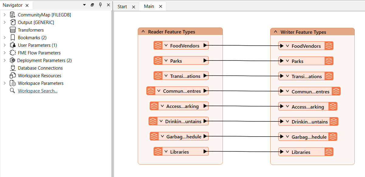 Jennifer opens the workspace in FME Workbench. The workspace reads in community features from the CommunityMap file geodatabase and then writes them out using a Generic writer, which allows writing to any FME-supported format.