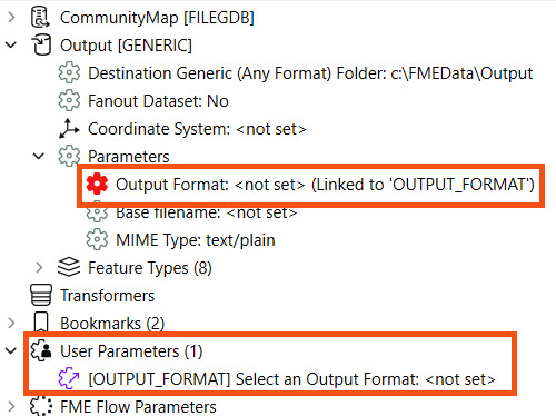 Jennifer has already created a user parameter to input the data output format, and it is linked to the writer's parameters. However, Jennifer would also like the end-user to select which feature types to include in the output.