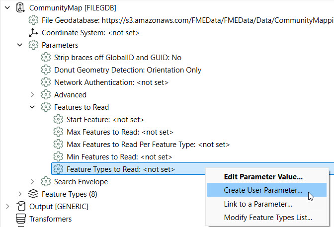In the Navigator pane, Jen expands the CommunityMap [FILEGDB] reader and further expands Parameters and Features to Read sections. Jennifer right-clicks the Feature Types to Read parameter and selects Create User Parameter.