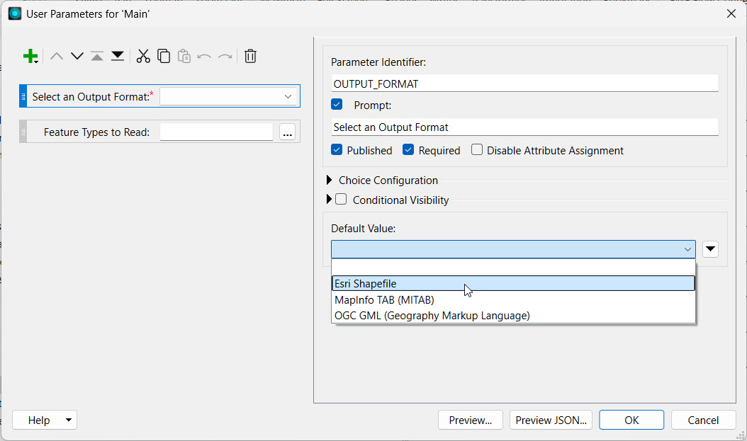 For the Output Format parameter, Jennifer sets the Default Value to Esri Shapefile. Under Choice Configuration, the format options have already been limited to Esri Shapefile, MapInfo TAB, and OGC GML.