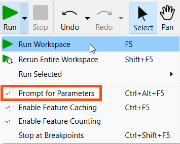 Jennifer runs the workspace, ensuring Prompt for Parameters is enabled to test that her user parameters are functioning as expected.