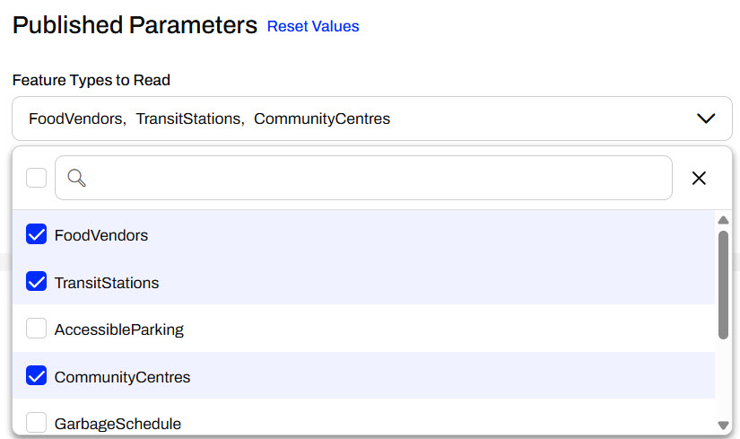 In addition to the OUTPUT_FORMAT parameter, Jennifer needs to create a parameter for the user to select which Feature Types to include in the output.
