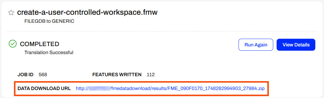 After the workspace runs, FME Flow presents Jennifer with the finished job status and the Data Download URL. Jennifer clicks the URL to download the data.