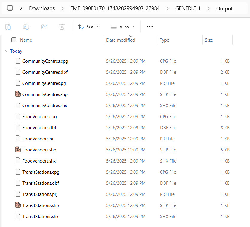 Jennifer extracts the zip file and opens the Output folder to see the data for the feature types she selected.