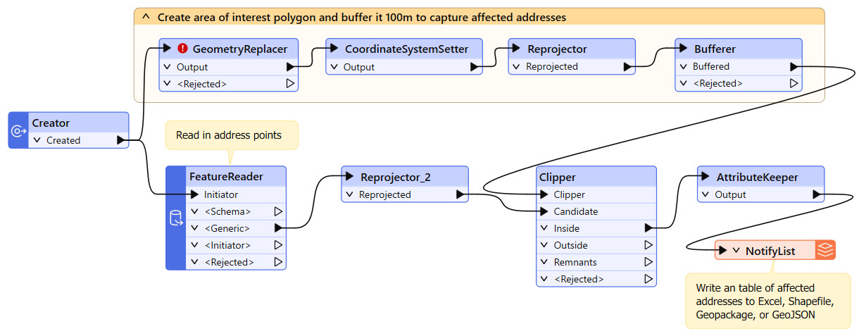 The workspace reads in Addresses, clips them to a buffered geometry input, and writes the clipped Address data in the user's choice format. The GeometryReplacer transformer is incomplete; it's missing input geometry, which Jennifer will remedy once she creates the Geometry parameter.