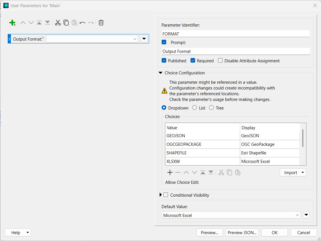 The Output Format parameter limits the format options to specific formats. It appears to the user as a drop-down selection, and the default format is Microsoft Excel.