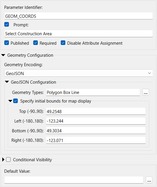 The initial bounds will be the area shown in FME Flow when the user opens the Geometry parameter map. Larger bounds will have the map zoomed out, and smaller bounds will have the map zoomed in. Jennifer's Geometry Parameter configuration looks like this:
