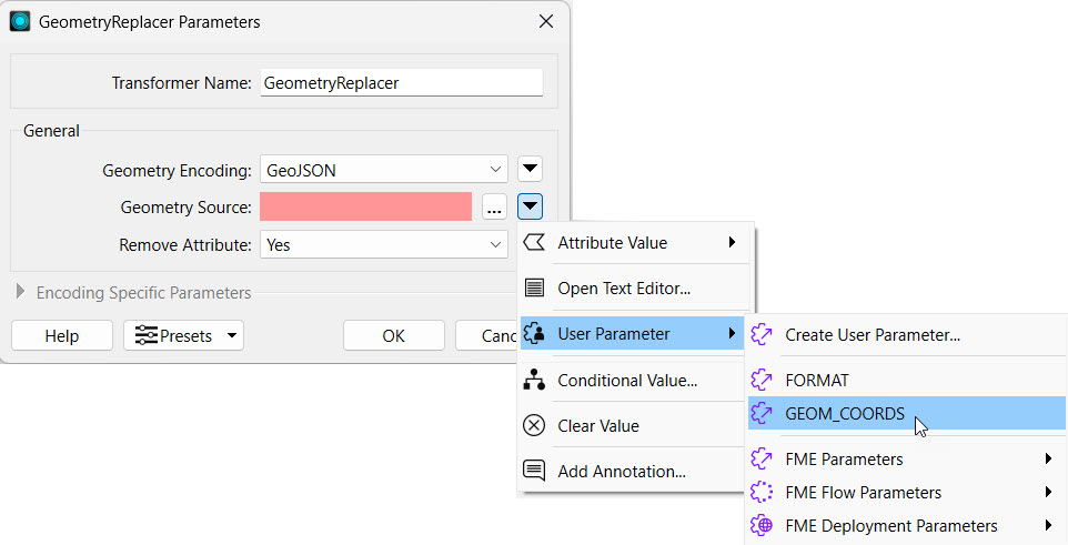 Jennifer opens the parameters for the GeometryReplacer. She ensures the Geometry Encoding is GeoJSON and then sets the Geometry Source to the GEOM_COORDS parameter.