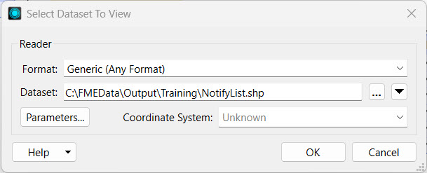 Now, Jennifer will test her workspace results before deploying it on FME Flow. She clicks Run to run the workspace. In the translation parameters prompt, Jennifer selects Esri Shapefile as the output format.