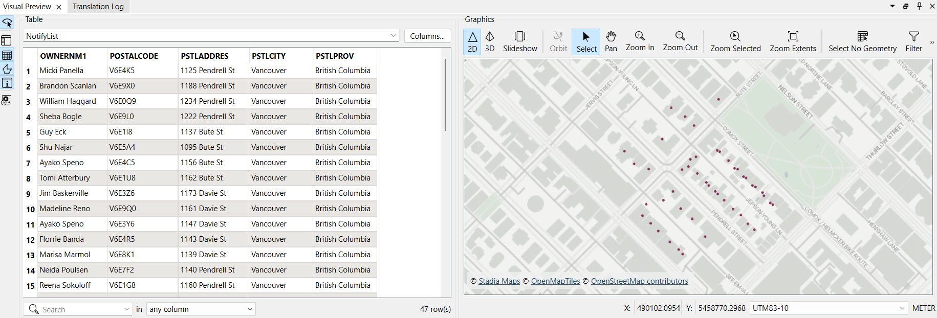 Optionally, Jennifer extracts and opens the data in FME Data Inspector. She can use this list to send letters to the residents affected by the construction.