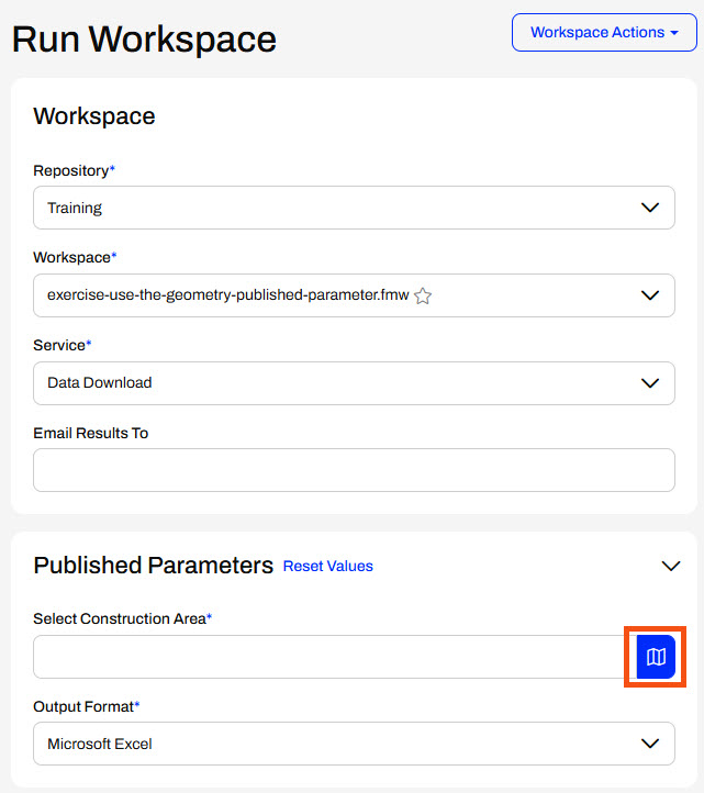 Under Published Parameters, Jennifer clicks the map icon for the Select Construction Area parameter.