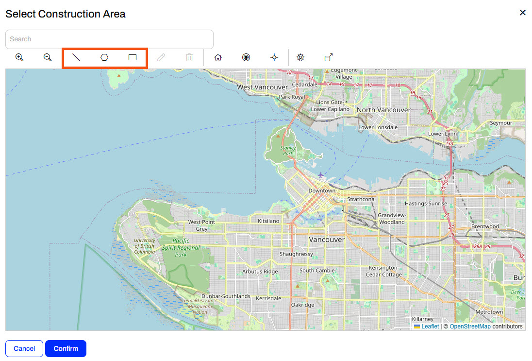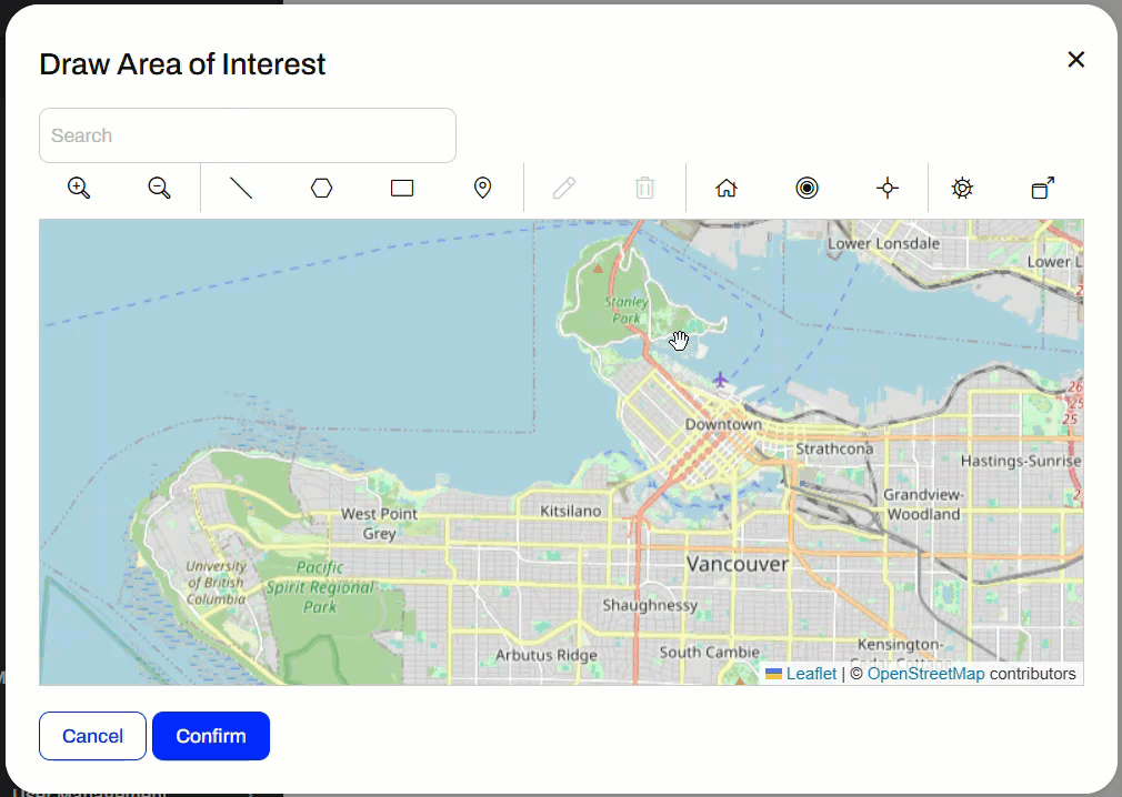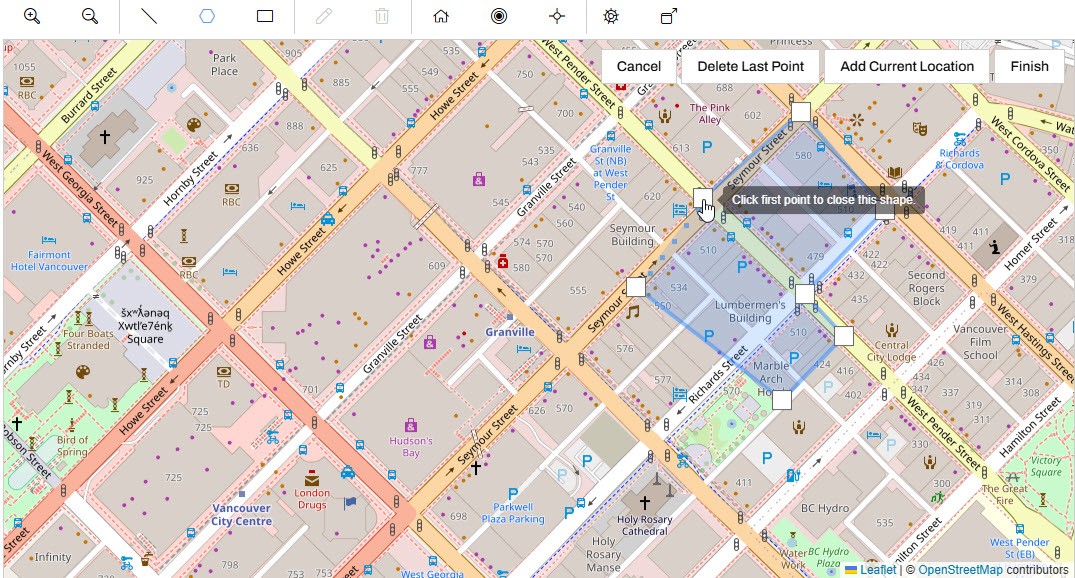 Jennifer zooms into downtown Vancouver, uses the polygon tool to pick an area, and clicks Confirm to close the map.