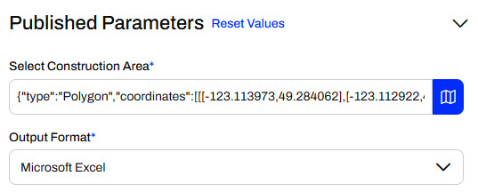 Jennifer confirms that GeoJSON coordinates are now present in the Select Construction Area parameter and leaves Microsoft Excel as the output format by default.