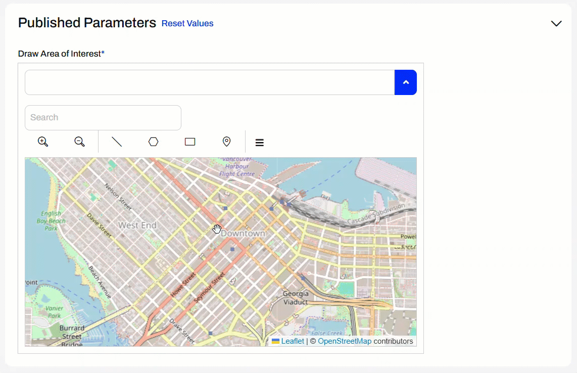 You create the ad hoc boundary option using a Geometry user parameter, which you link to create a feature in the workspace. This parameter lets you draw a point or an area of interest to input into a workspace on FME Flow.