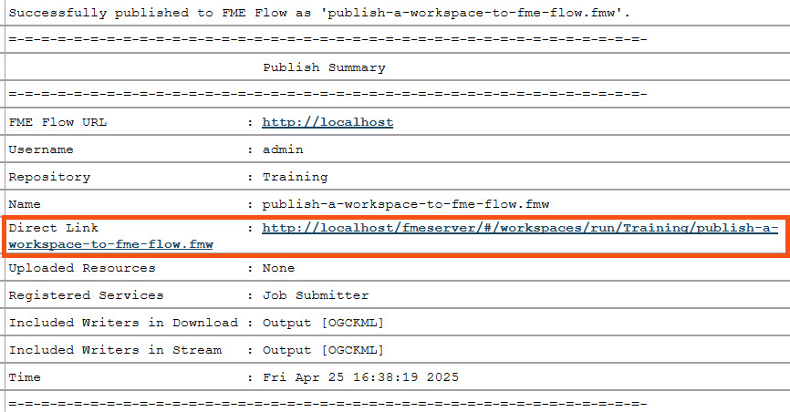 Now that the workspace writes data using the FME Flow parameter, Jennifer clicks OK to close the writer settings and is ready to publish it to FME Flow.