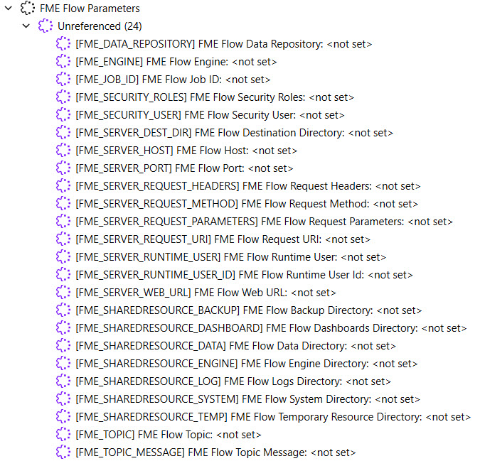 FME Flow parameters reference FME Flow system settings to customize and control workspaces run from FME Flow. FME Workbench lists the FME Flow parameters in the Navigator window for easy insertion into workflows.