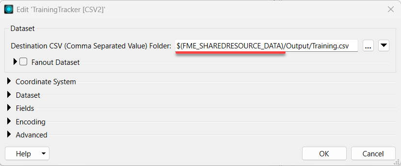 Like user parameters in FME Workbench, FME Flow parameters can be hardcoded into workspace parameters following the $(FME_FLOW_PARAMETER) format. Here's an example where the FME Flow Resources Data folder is referenced using the $(FME_SHAREDRESOURCE_DATA) parameter for an output CSV location.