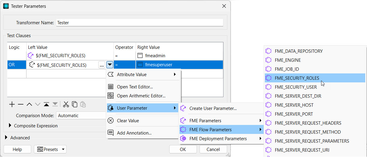 FME Flow parameters are linked to readers, writers, and transformers, similar to how existing user parameters are linked. Here's an example of using the FME_SECURITY_ROLES parameter in a Tester to filter for users belonging to the fmeadmin or fmesuperuser roles on FME Flow. This workflow could be expanded to write specific data to the user if they belong to one of those roles. Otherwise, the data may be excluded.