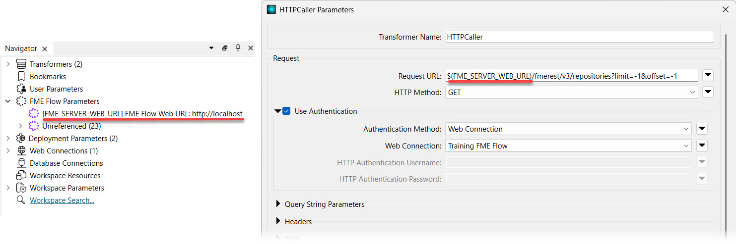When running workspaces referencing FME Flow parameters on FME Workbench, you must assign a value to the FME Flow parameter. However, when a workspace runs on FME Flow using these parameters, FME Flow automatically fills in the value based on the FME Flow system settings. Here's an example where the FME_SERVER_WEB_URL parameter is referenced in an HTTP Caller to make a GET request to the FME Flow REST API. To run successfully on FME Workbench, you must enter the URL http://localhost into the FME_SERVER_WEB_URL parameter.