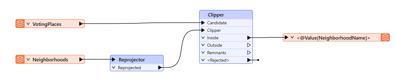 Jennifer continues updating workspaces that will be deployed on FME Flow. She's working on one that clips election voting locations by neighborhood and writes a list of voting places for each neighborhood. This workspace currently writes the data to a local file system, and Jennifer shares it with users who need it for their FME workflows. However, others will easily access it if it were written to the FME Flow Resources, so other users' workflows can easily read the data in from Resources. To accomplish this, Jennifer will use the $(FME_SHAREDRESOURCE_DATA) parameter to write the output data to the FME Flow Resources Data folder.