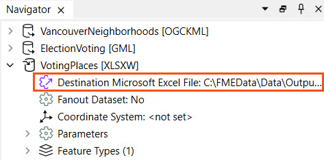 Jennifer expands the VotingPlaces [XLSXW] writer parameters in the Navigator and double-clicks the Destination Microsoft Excel File parameter.
