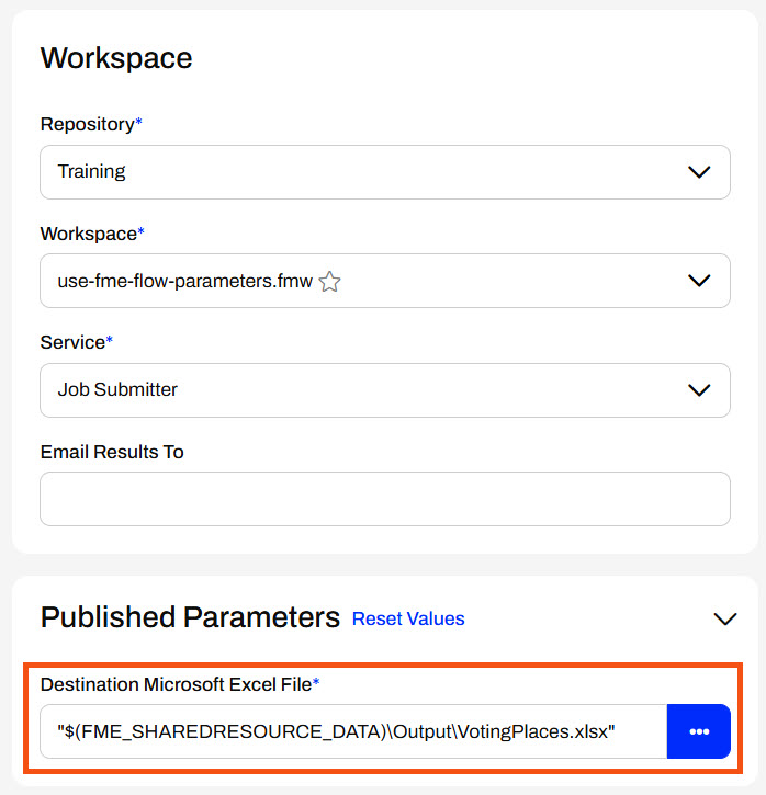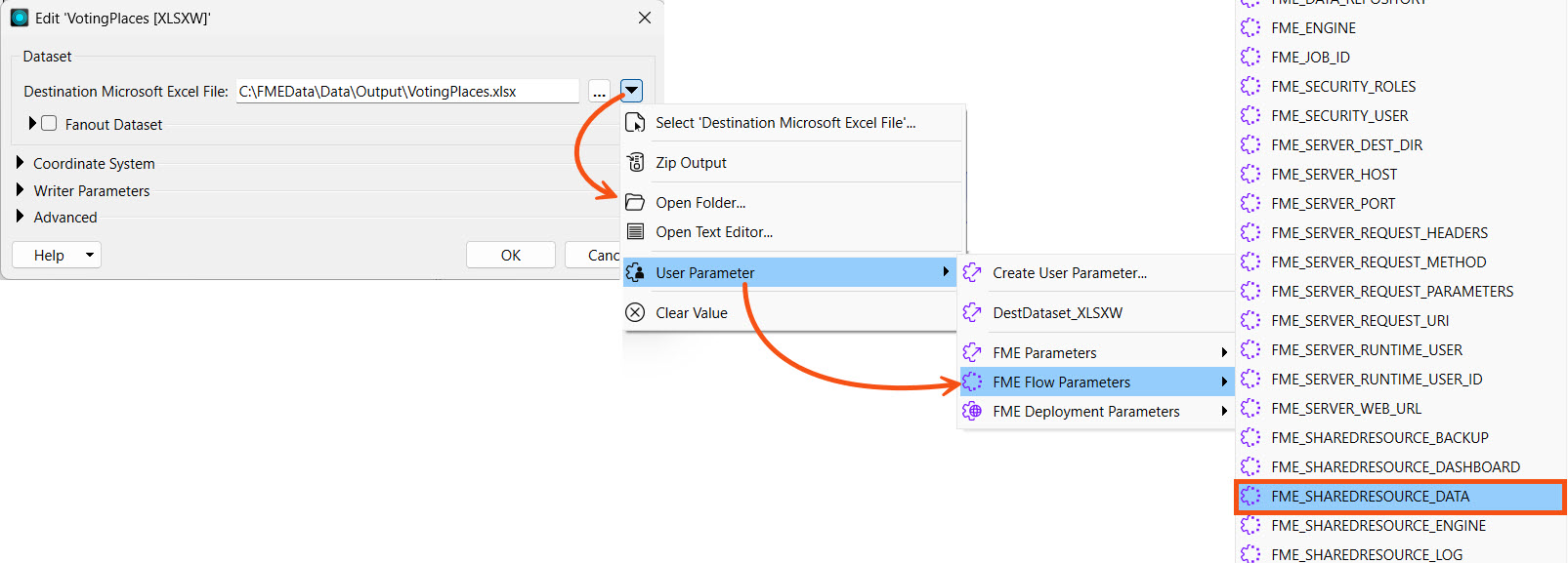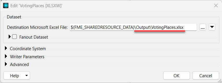 She uses the drop-down arrow to select the $(FME_SHAREDRESOURCE_DATA) FME Flow parameter and then adds \Output\VotingPlaces.xlsx.