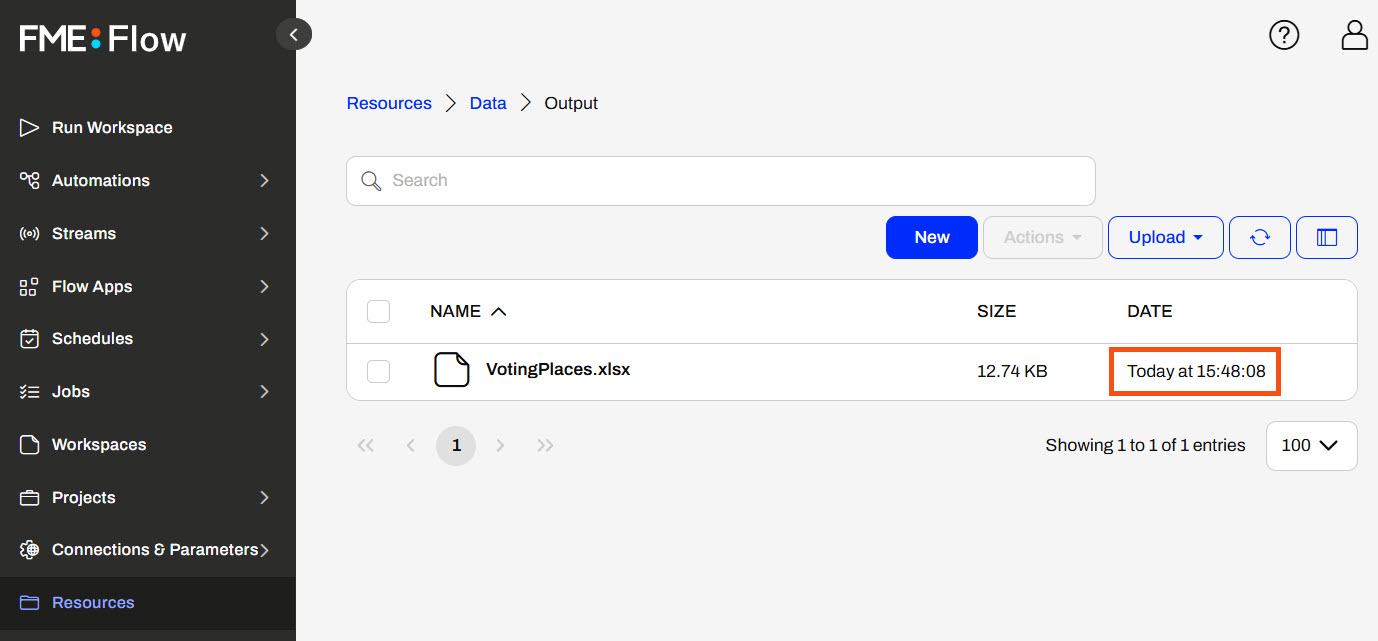 Here, she sees that her workspace wrote the VotingPlaces.xlsx file a moment ago. Her workspace used the $(FME_SHAREDRESOURCE_DATA) parameter to reference the FME Flow Resources location for the output. Jennifer's next steps will be to automate this workflow and run it on a schedule to keep the data updated in Resources for other users to access.