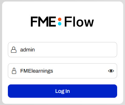 If you're taking a Safe Software-hosted training course, you can access FME Flow at http://localhost and the FME Flow login credentials are username: admin and password: FMElearnings.