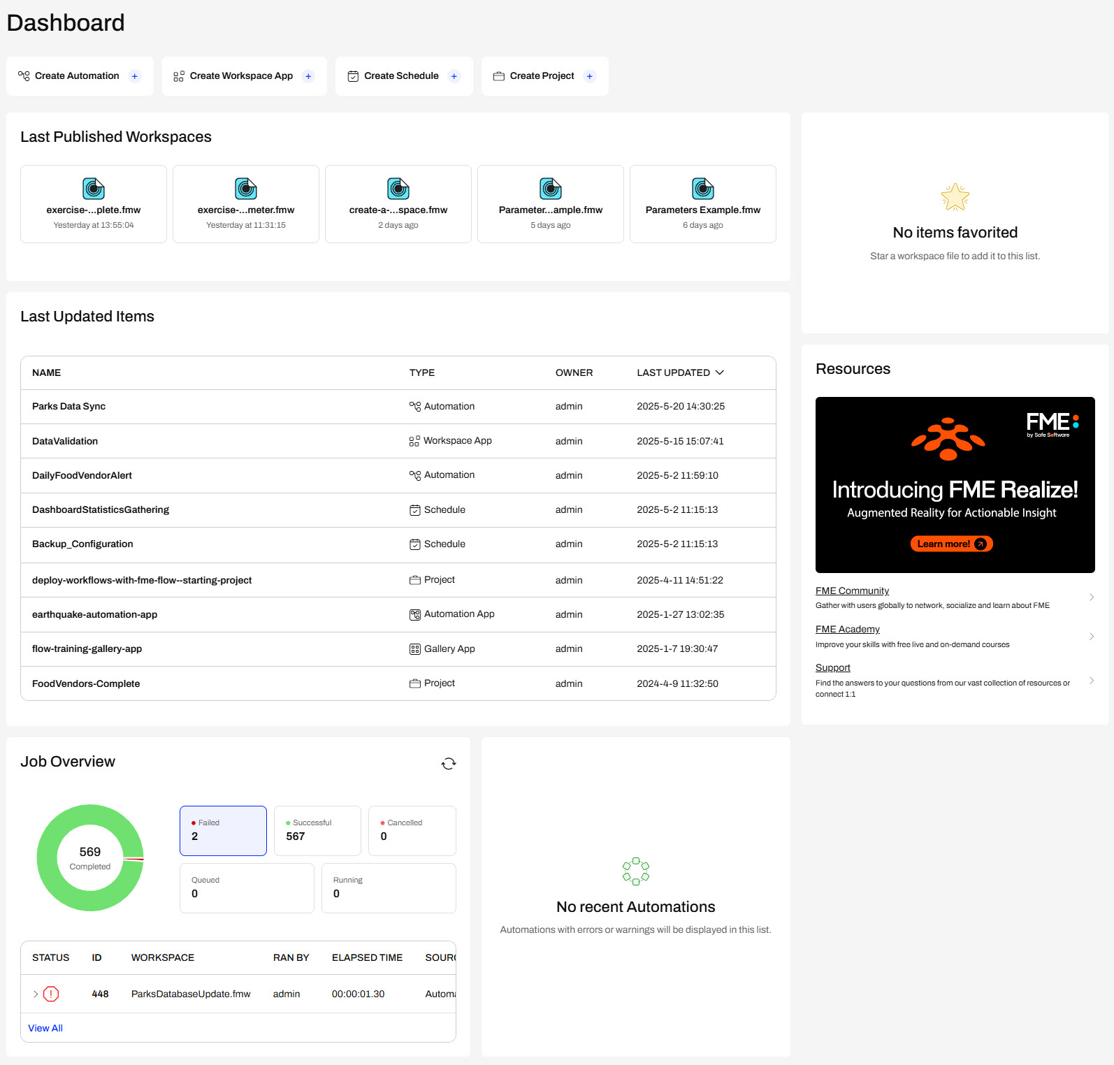 Across the top, there are shortcuts to FME Flow functions. The main part of the page provides an overview of recent activity, including the latest published workspaces, updated items, job requests, and Automations. Sven can click on any of these items to open them on FME Flow quickly. Since Sven is an admin, he can access almost all content and functionality on FME Flow. If he does not have permission to access other users' content, he will only see an overview of his own items on the FME Flow Dashboard. On the right side of the Dashboard, Sven can access his favorite items and links to helpful FME resources.