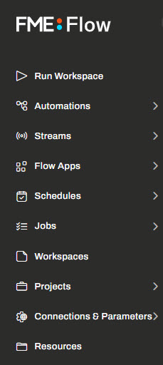 On the left side of FME Flow, Sven examines the menu that allows him to navigate to all the different functions of FME Flow. Sven can click the FME Flow logo at the top to bring him back to the Dashboard anytime.