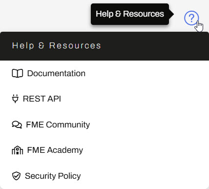 Sven sees the Help & Resources button in the top-right corner of FME Flow. He clicks on it and sees its options lead to many pages with help and support for FME Flow and the FME Flow REST API. Sven makes note of these because the resources will be extremely useful to him as he continues using FME Flow.