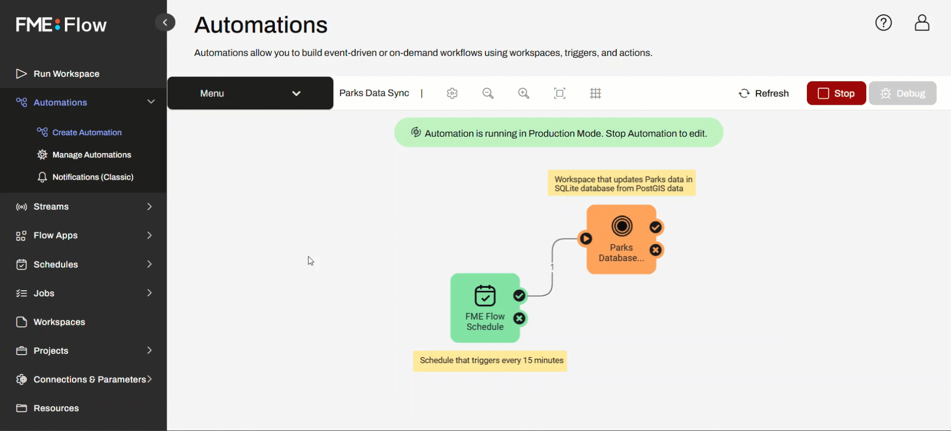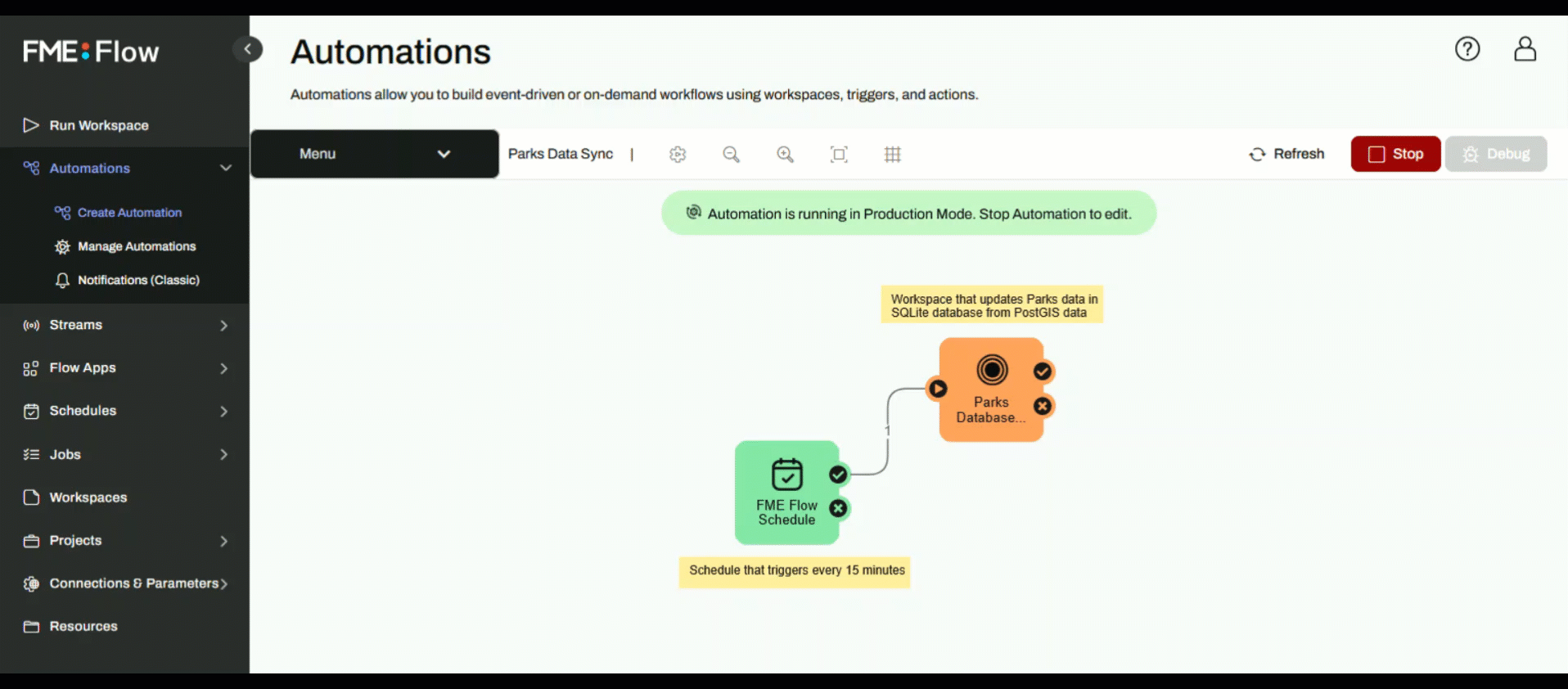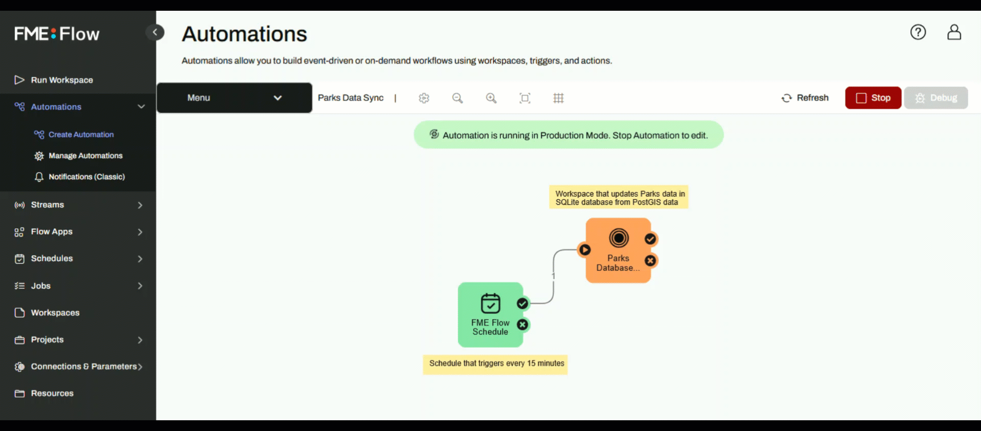 For the first part of this tour, you will start and trigger an Automation that runs a workspace to perform a database update. While reading and writing to any of FME's many supported formats, this workspace reads Parks data from our FME Training PostGIS database and writes it to a SQLite database on FME Flow. This Automation runs on a schedule every 15 minutes to keep the database up to date with the latest data.