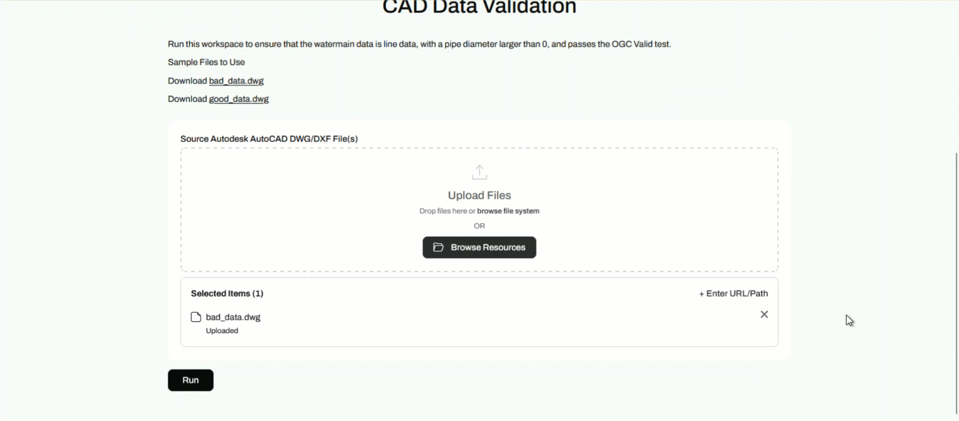This App provides some sample data to download by clicking the link. Then, upload the bad_data.dwg from the file system to the App.